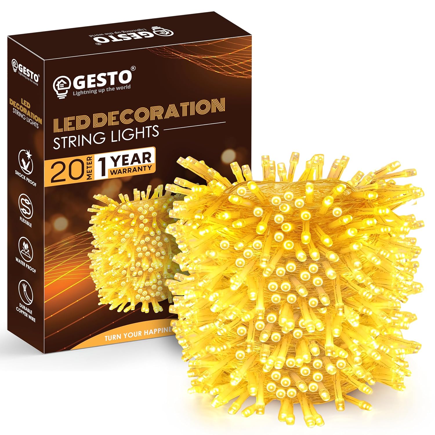 Gesto 20 Meter Led Serial String Lights – AC Plug Waterproof Copper Wire Yellow Fairy Light for Home Decoration,Christmas,Garden, Deepawali & Diwali Decoration Lights for Balcony Outdoor- Warm White